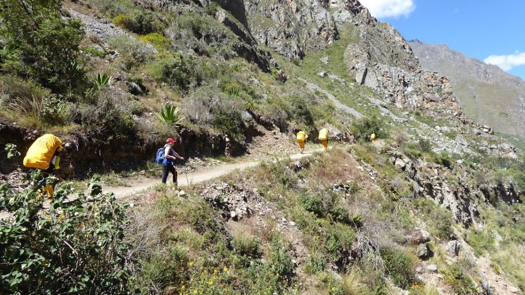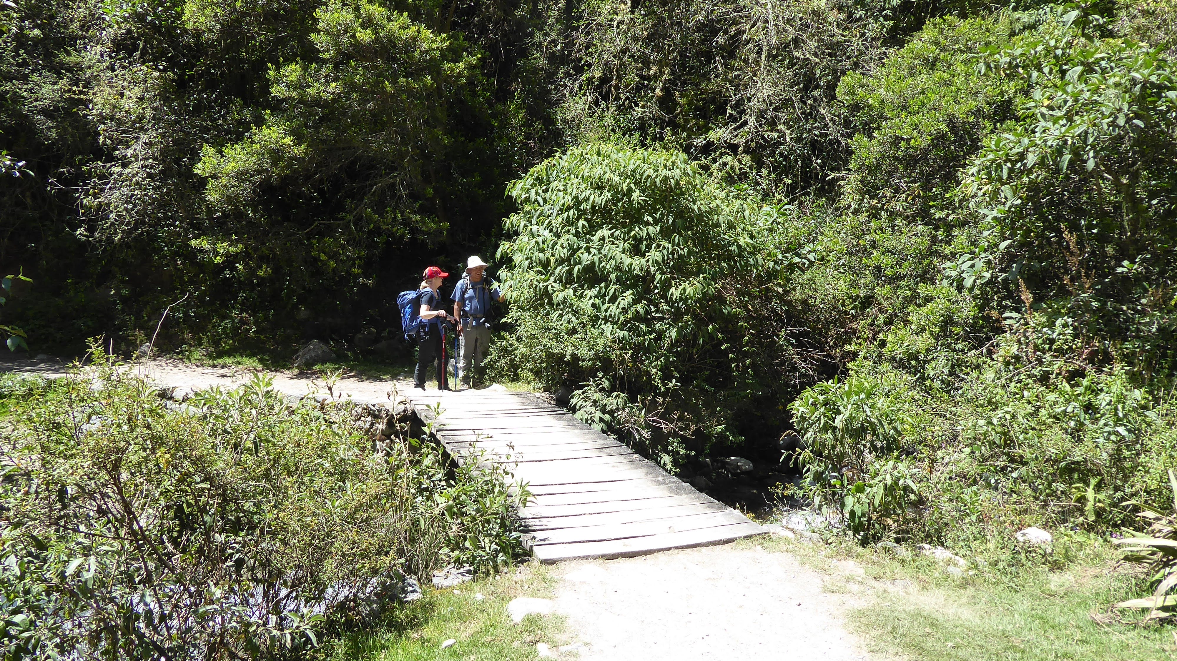 The guys finally wandered over to join me and imbibe the scenery and Alfredo noticed us and captured the above picture. I finally and reluctantly tore myself away from the view and went back to get ready for that day’s walk. I was feeling remarkably buoyant. The sun was beginning to show its’ cheery face and the damp of the night before was already a dim memory. Joints were limber from use and I felt like a spring rabbit as I bounced away from the camp and started down the steep steps towards the next ruins which were called Intipata